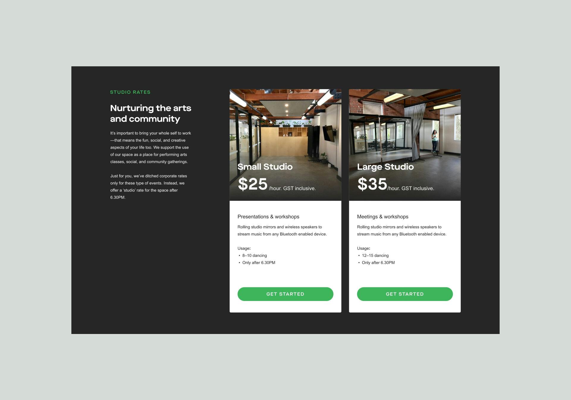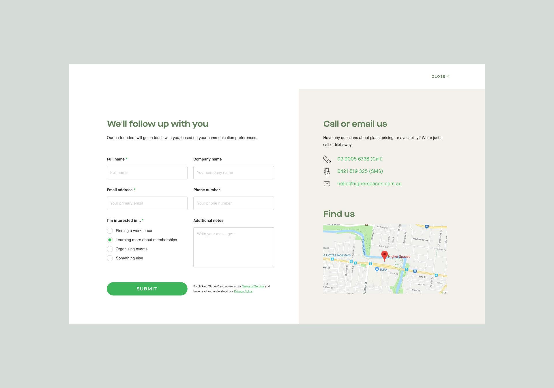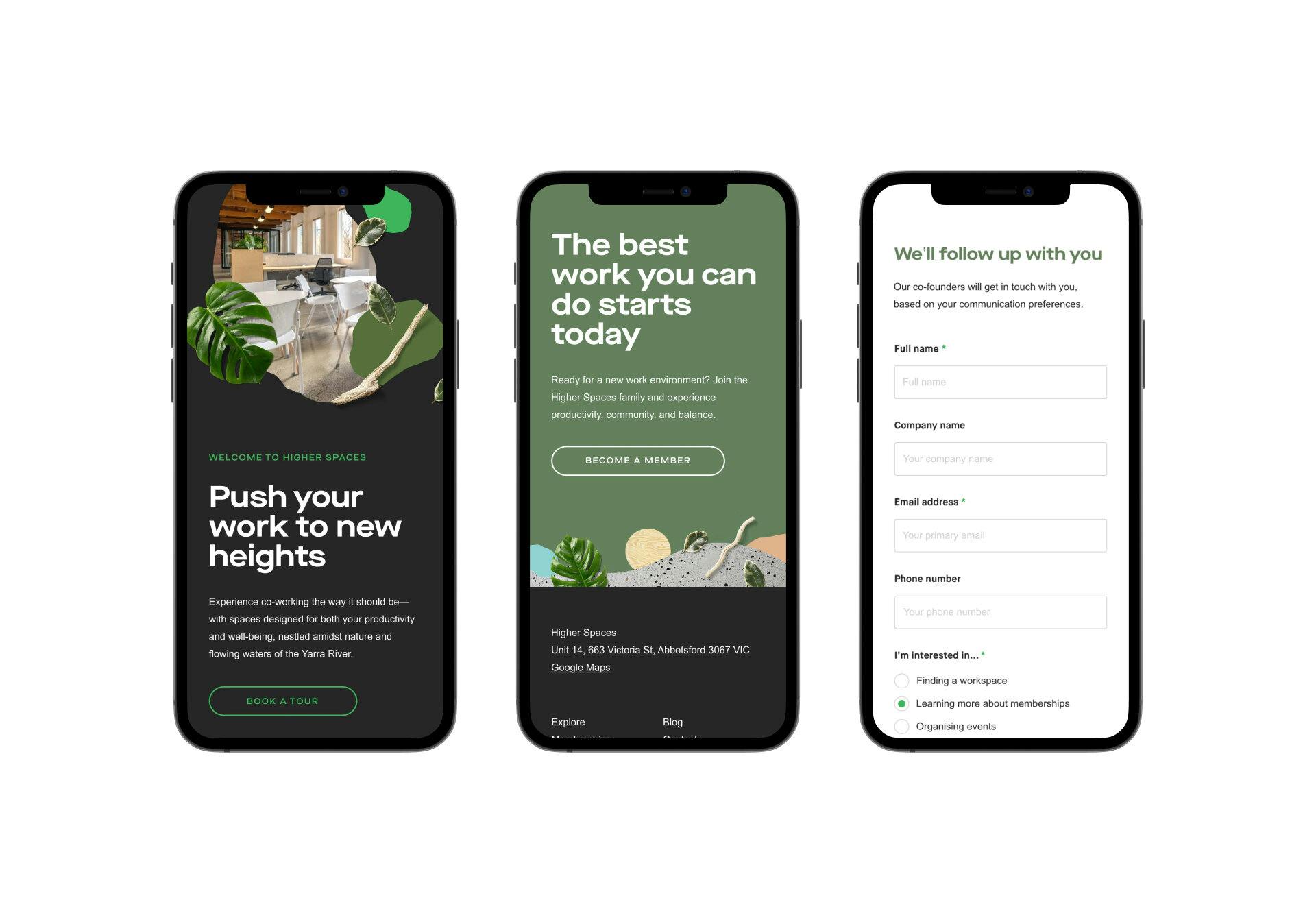 Gridhaus redesigned the Higher Spaces website, the main touchpoint for incoming leads and central hub for communicating Higher Spaces’ identity, services, and pricing.