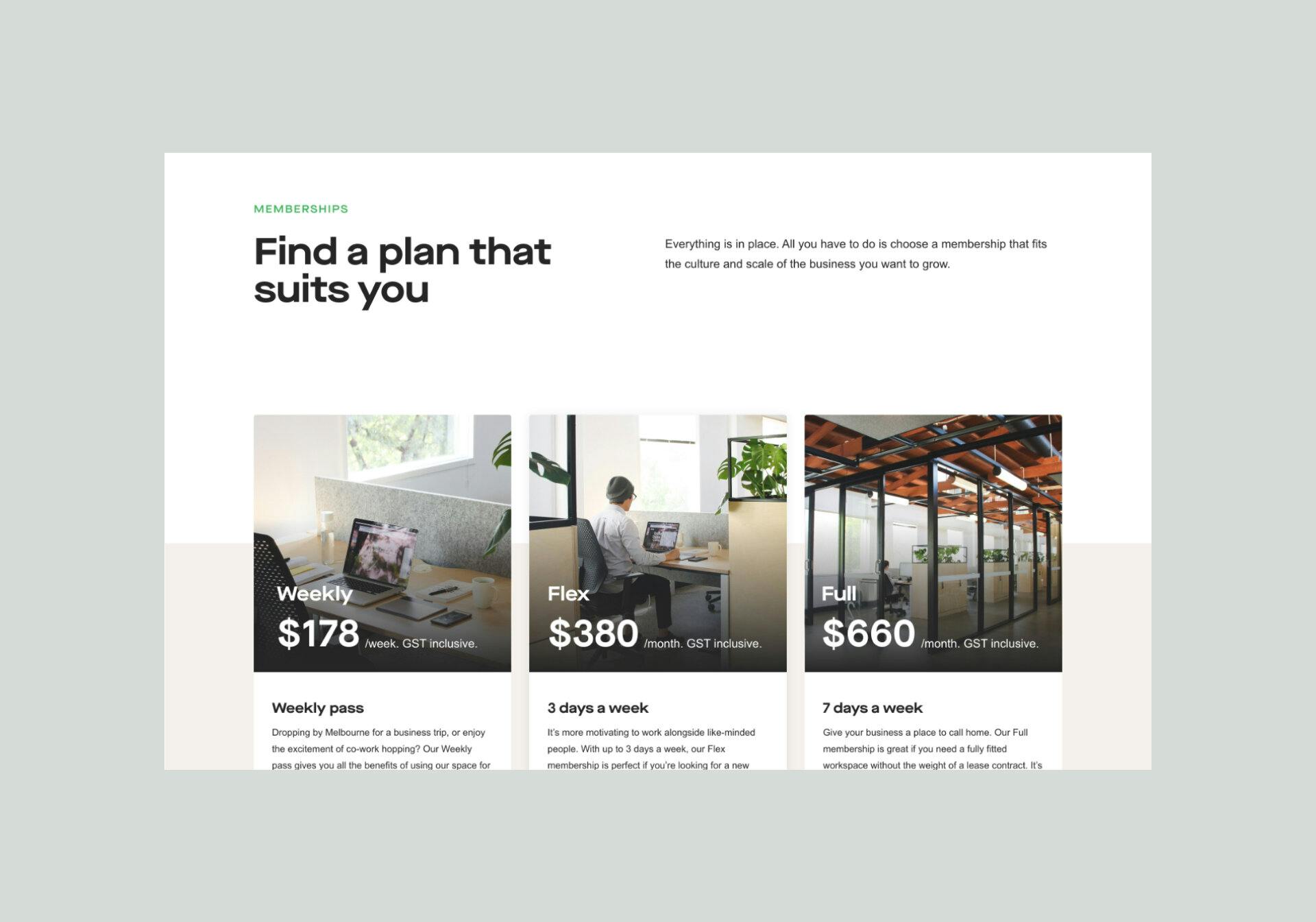 The goal was to make it easier for users to find a package that best suited their needs—be it a hot desk, long term rental for a team, or booking conference and event spaces.